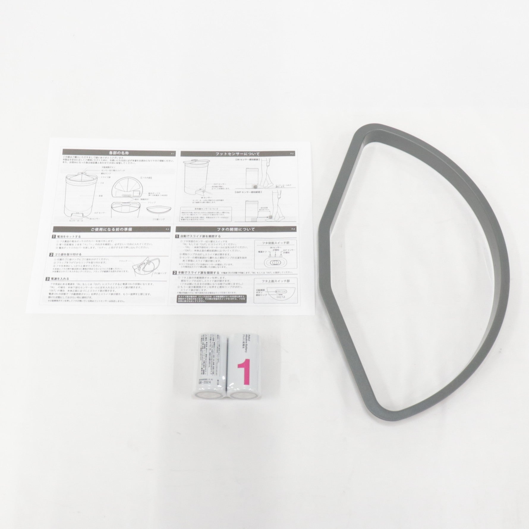 ・本体(ボディ) ・自動開閉フタ ・ゴミ袋リング ・取扱説明書 ・単一形乾電池×2本