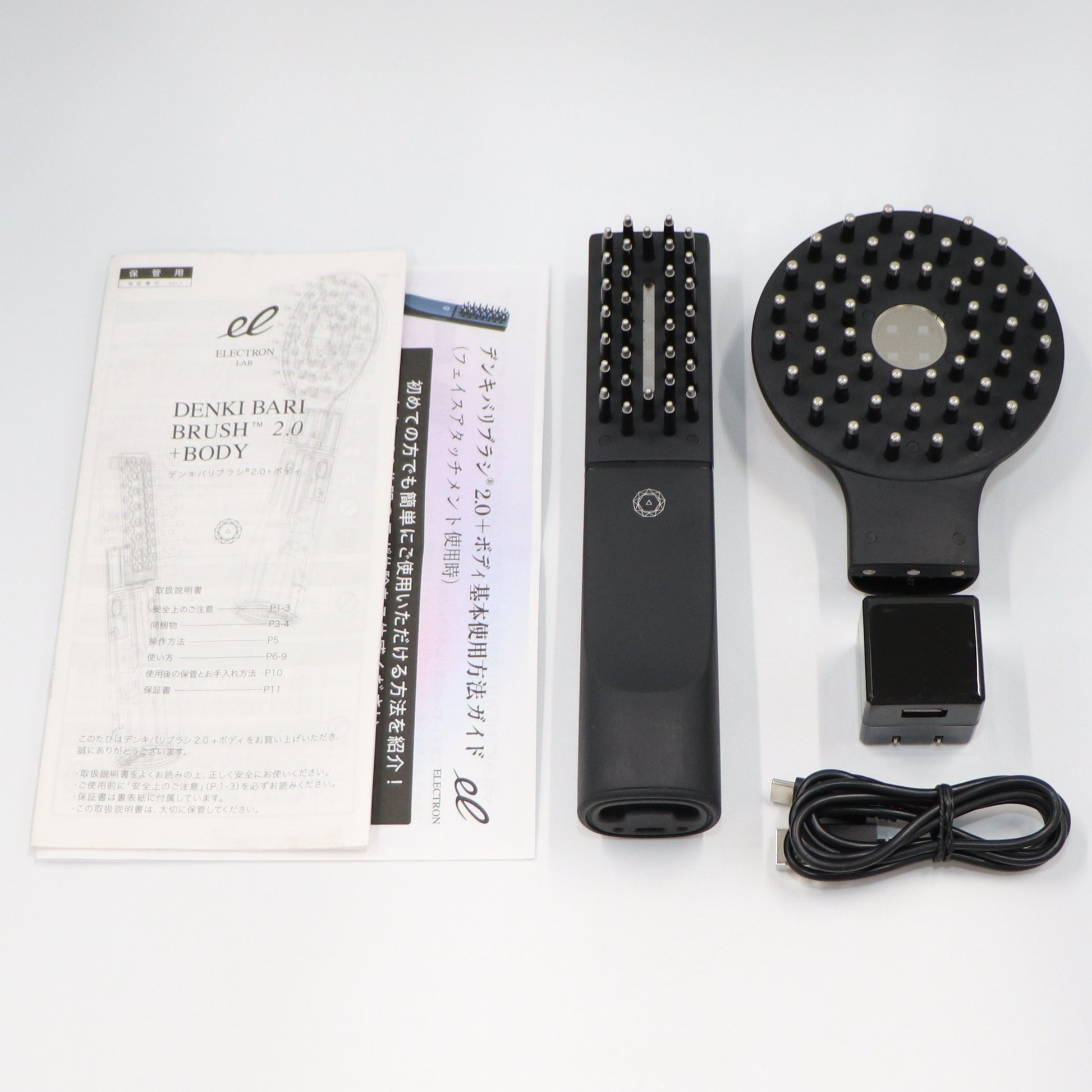 ・デンキバリブラシ®︎2.0 本体 ×1 ・フェイス アタッチメント ×1 ・ボディ アタッチメント ×1 ・USB ケーブル ×1 ・ACアダプタ ×1 ・取扱説明書 ×1 ※別紙の注意書きも必ずご確認ください ※デンキバリブラシローションの付属はございません。公式サイトよりお買い求めいただけます。