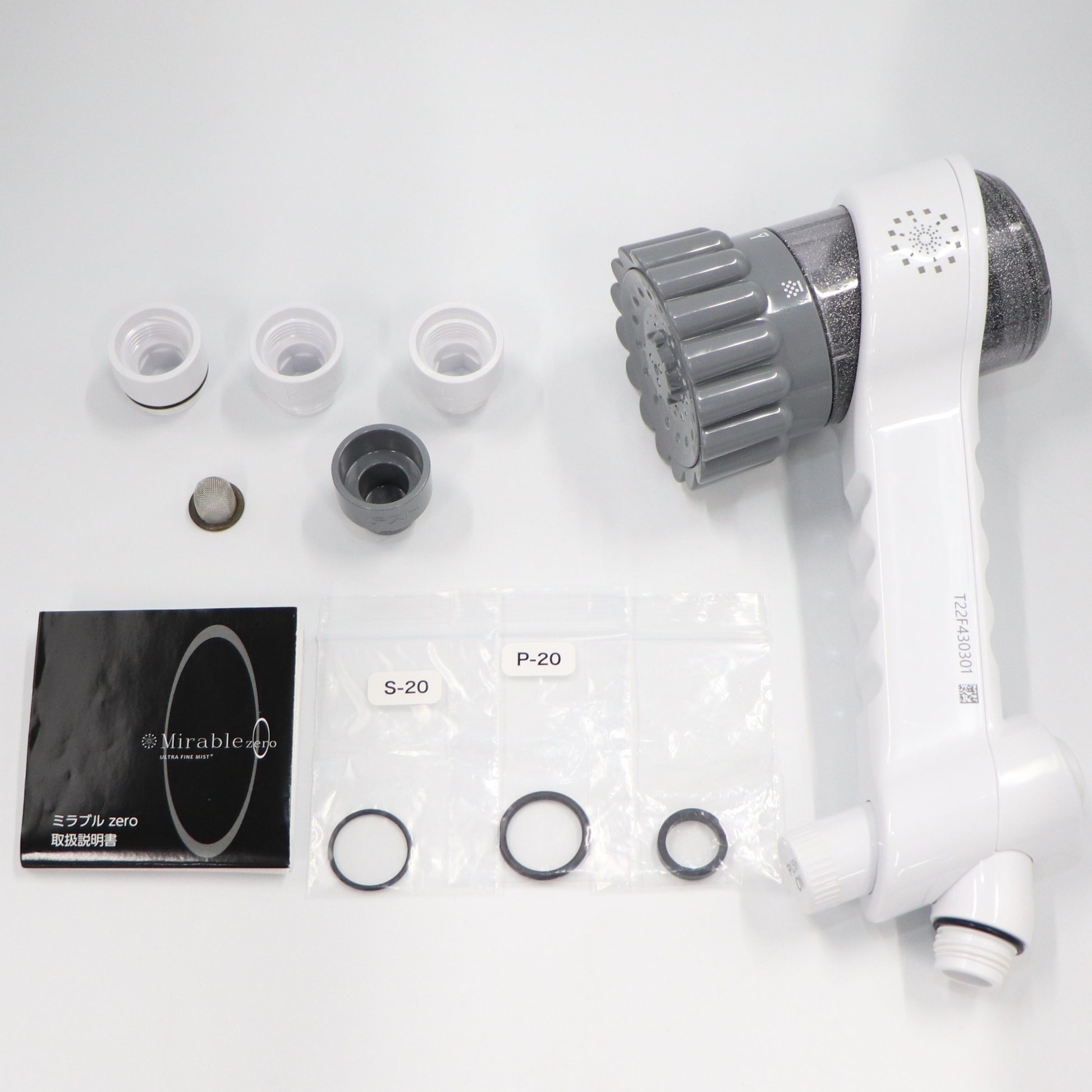 ・ミラブルzero本体 ・シャワーホースアダプターセット ( K:KVK用 / M:MYM用 / L:LIXIL用 ) ・Oリング (P-20 / S-20) ・シャワーパッキン ・取扱説明書 ※取扱説明書は傷みや汚れがある、またはコピーの場合があります