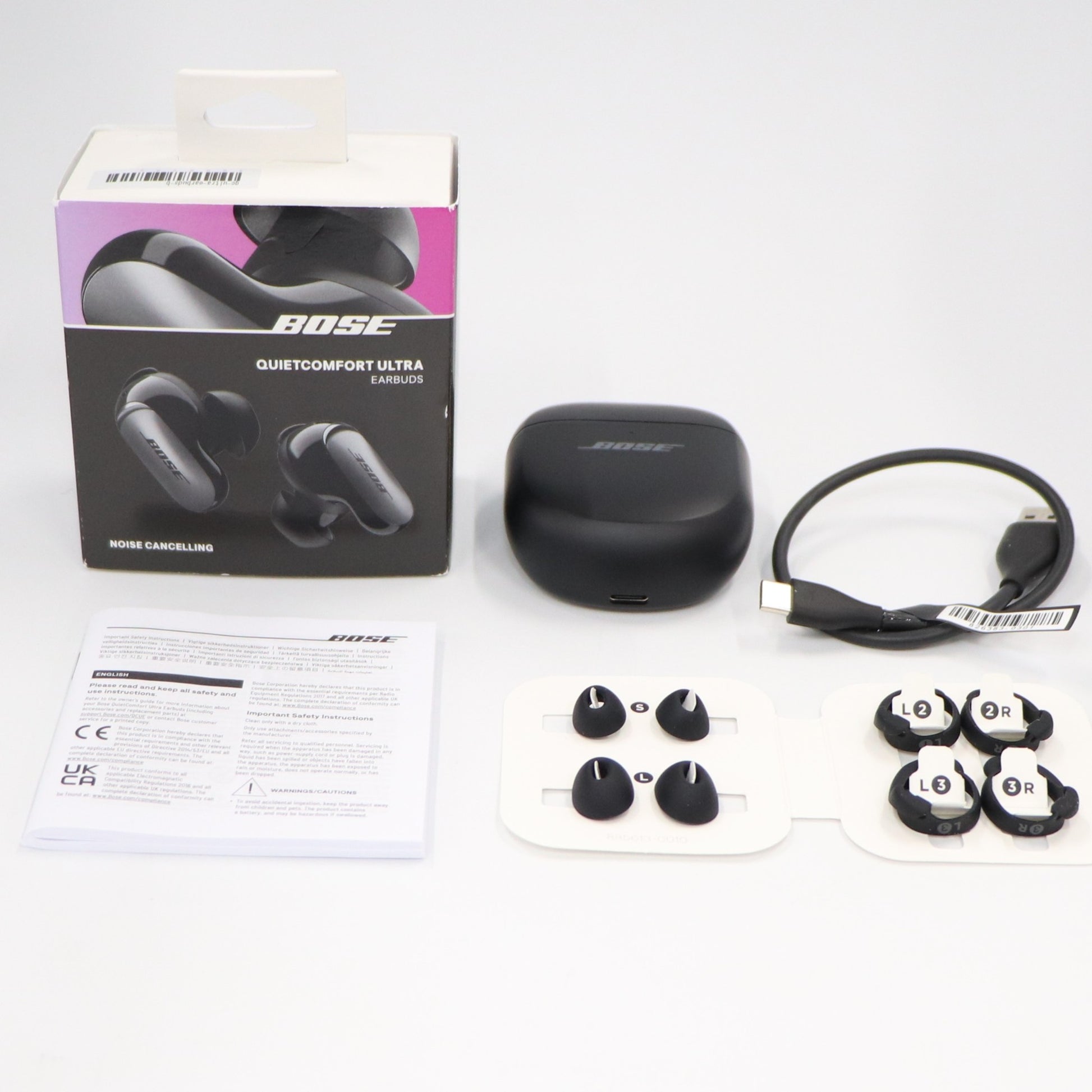 ・QuietComfort Ultra Earbuds 本体(LとR・1ずつ) ・イヤーチップ (S、M、L、各1 ペア) ・スタビリティバンド (1、2、3、各1 ペア) ・充電ケース ・充電用USBケーブル Type-C