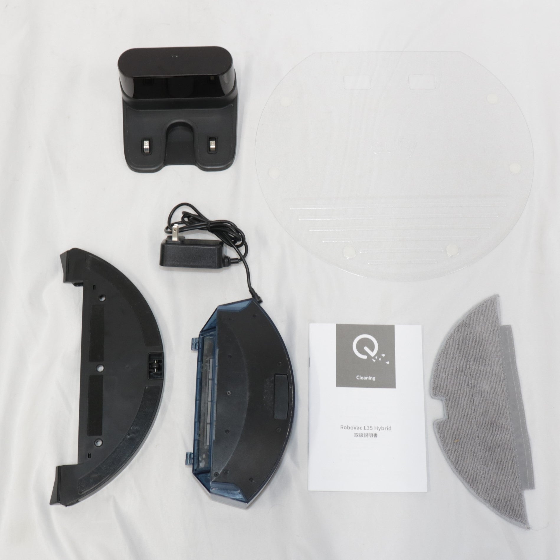 ・ Eufy RoboVac L35 Hybrid ・充電ステーション ・ACアダプタ ・ダスト容器と水タンク(2in1) ・モップモジュール ・モッピングクロス(×1) ・防水パッド ・サイドブラシ(×2 本体装着済) ・ 取扱説明書