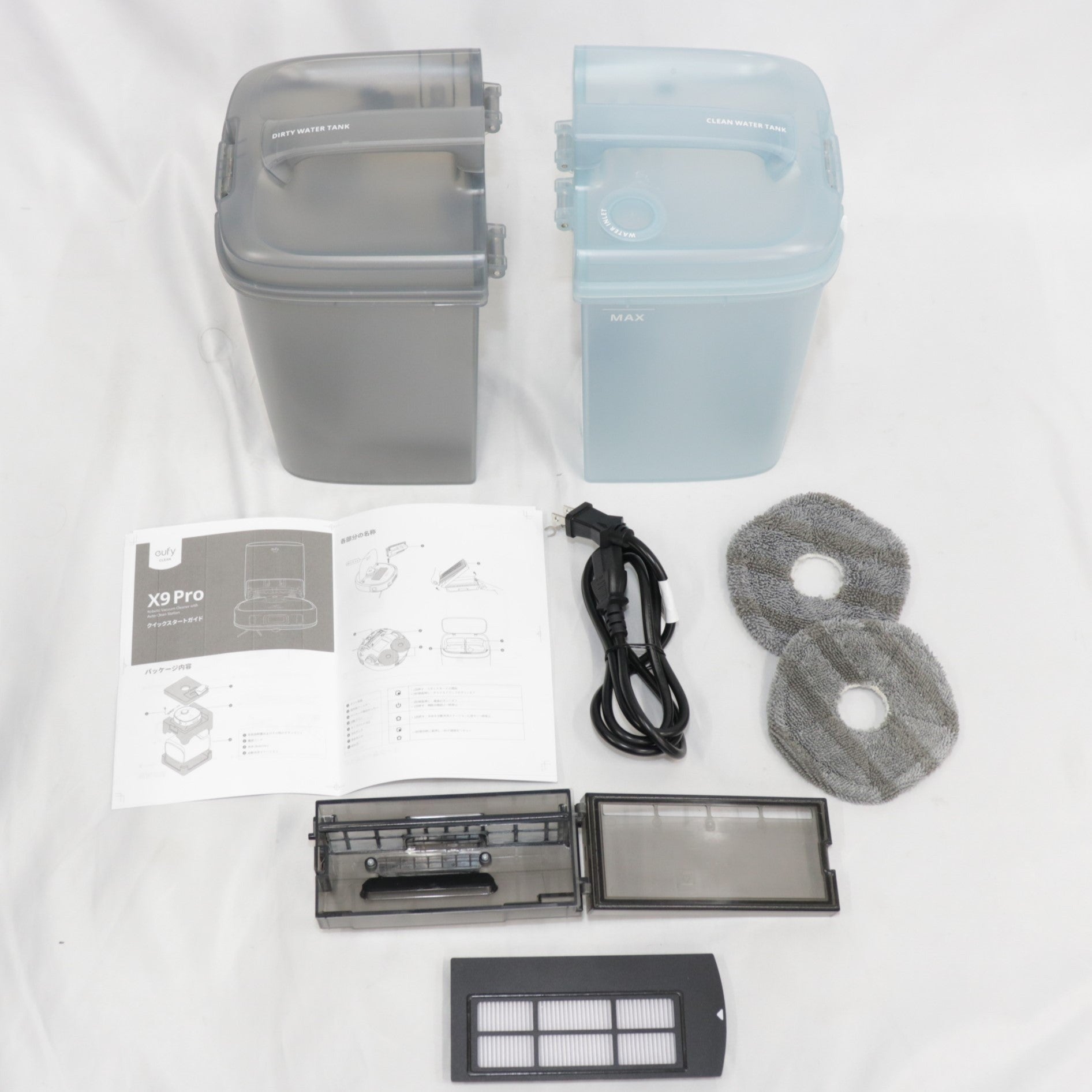 ・本体 ・自動洗浄ステーション ・電源コード ・モップパッド ×2 ・サイドブラシ(装着済み) ※サイドブラシは装着済みのためネジパックは同梱しておりません。 ・取扱説明書