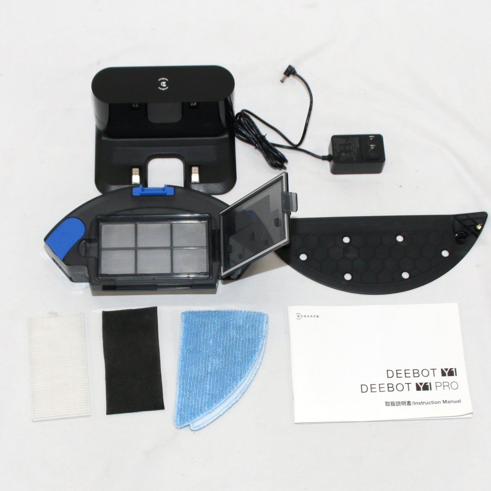 ※写真をご確認ください。 ・本体 ・取扱説明書 ・充電台 ・ゴム製メインブラシ(装着済み) ・電源ケーブル ・洗えるモップパッド ・モッププレート